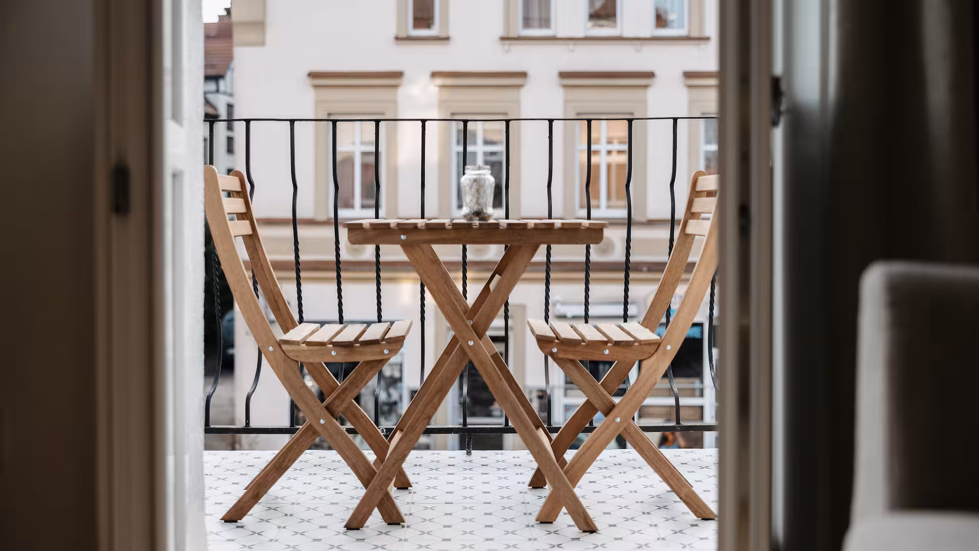 Smart TV, stół z krzesłami, balkon idealny na poranną kawę, meble ogrodowe