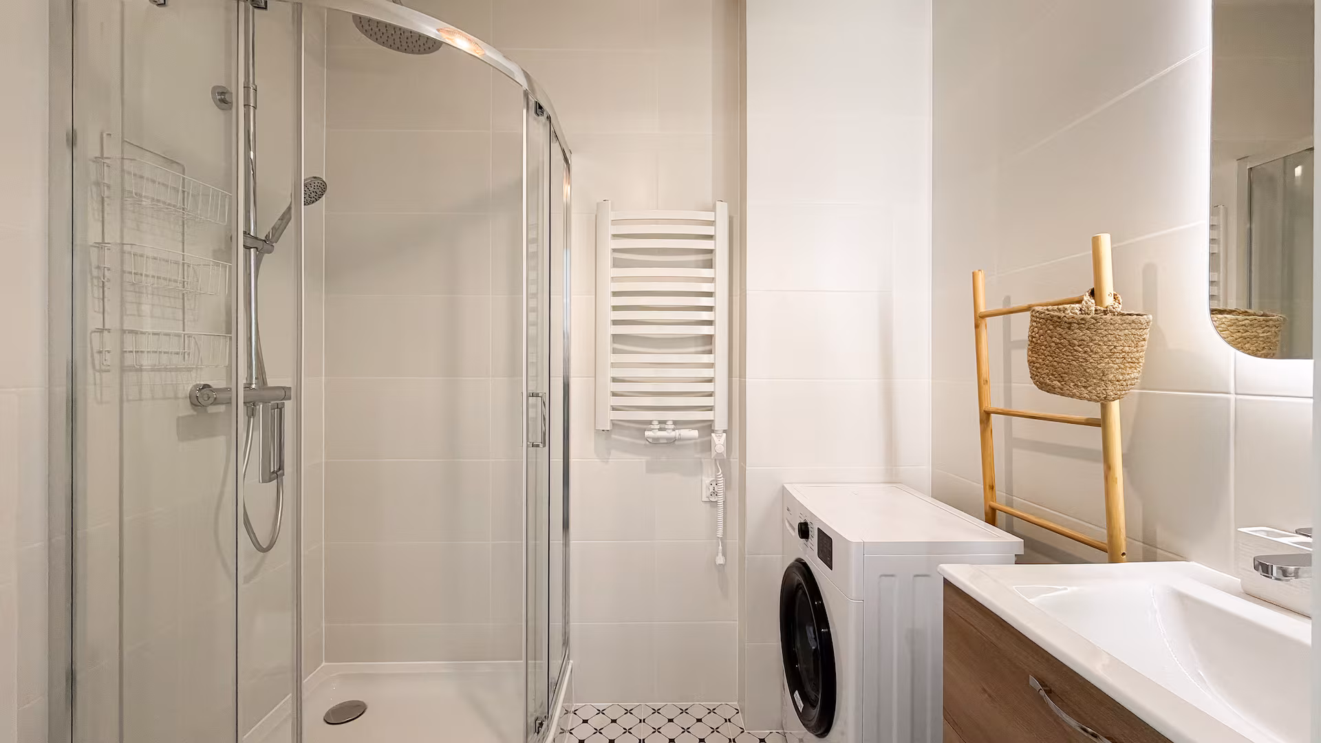 Kabina prysznicowa, pralka, suszarka do włosów, ręczniki