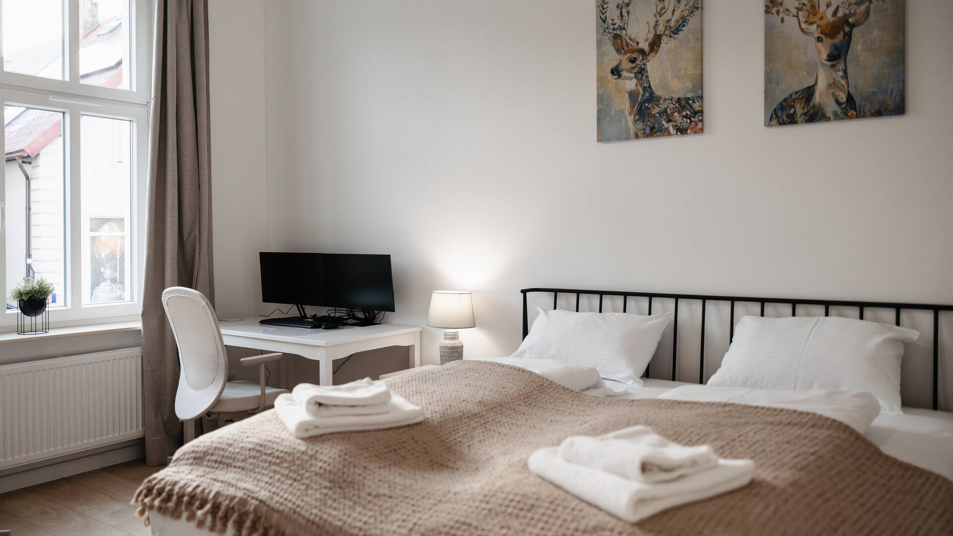 Łóżko małżeńskie, Smart TV, miejsce do pracy zdalnej dla 2 osób, 2 monitory 24", stacja dokująca Dell, myszka i klawiatura