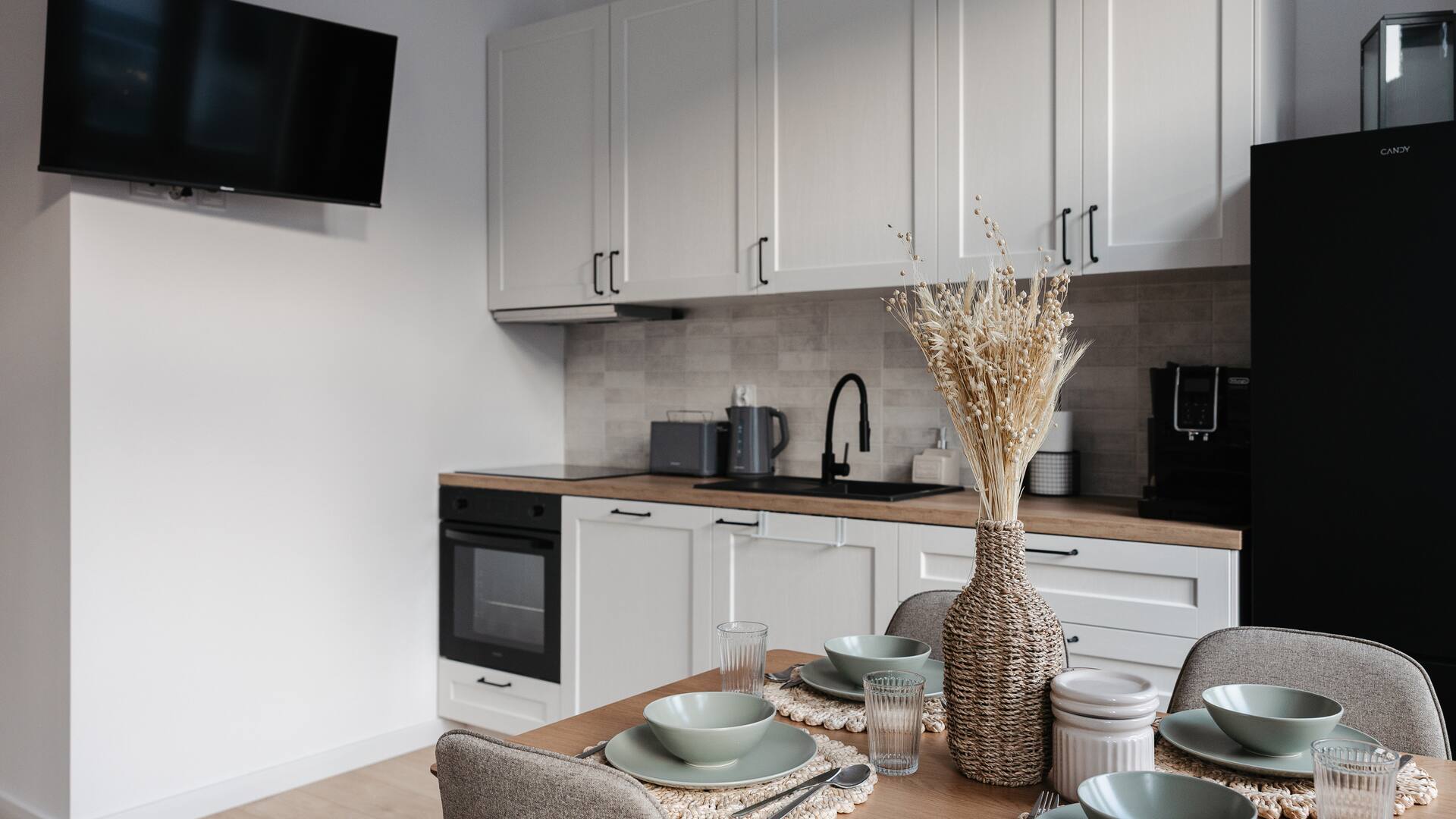 Zmywarka, ekspres do kawy (automatyczny), piekarnik, płyta indukcyjna, toster, czajnik, lodówka, przybory kuchenne i serwowanie potraw